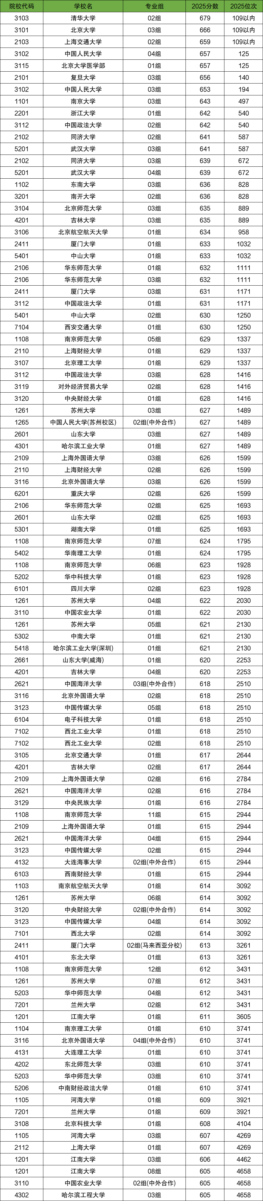 历史类分数线最高、最难考的是清华大学(代号3103),2025年最低分679,最低位次109名以内。其次是北京大学(代号3101),2025年最低分666,对应最低位次109名以内。(本文篇幅有限,仅列举分数前100)