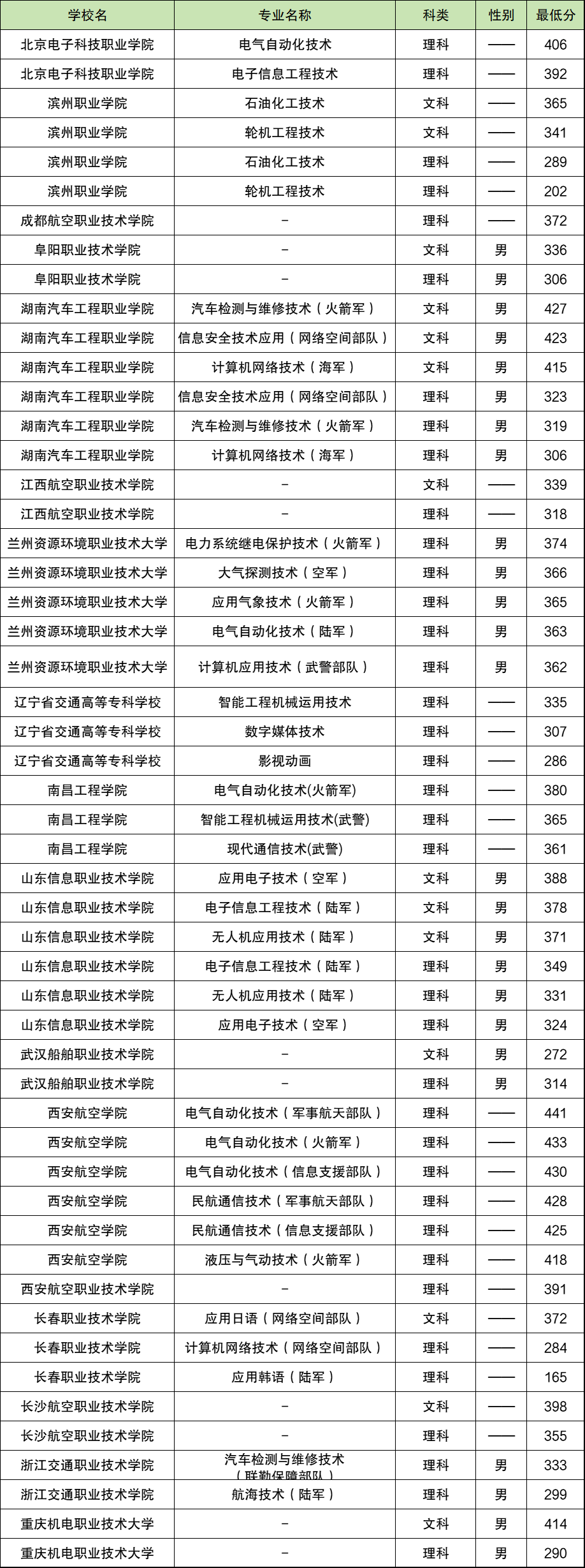 在陕西招收150人。其中,机电一体化技术(空军)历史类14人、物理类21人,无人机应用技术(武警部队)历史类6人、物理类11人,汽车制造与试验技术(空军)历史类27人、物理类48人,航海技术(海军)历史类10人、物理类18人,轮机工程技术(海军)历史类10人、物理类18人,信息安全技术应用(海军)历史类4人、物理类10人。