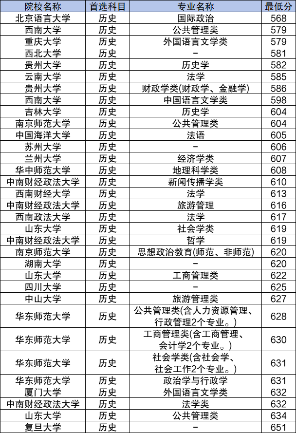 山东大学(公共管理类634分)、中南财经政法大学(法学类632分)、厦门大学(外国语言文学类632分)、华东师范大学(政治学与行政学631分)等。