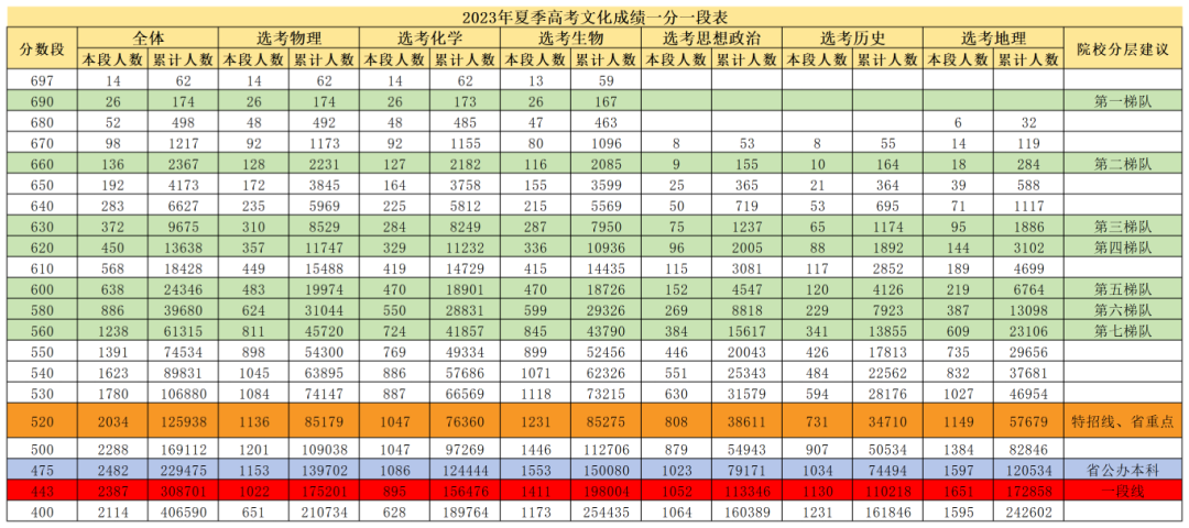 为让2024届考生能利用换算来的省排名进行志愿规划,下面附上2023年山东高考一分一段表(部分)和院校分层建议,以供大家参考: