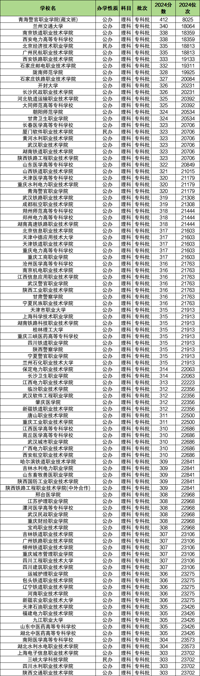 2024年青海省专科大学的最低录取分数线是129分,对应位次排名是32511,即2025年高考3万名左右的同学都有机会上专科批大学。