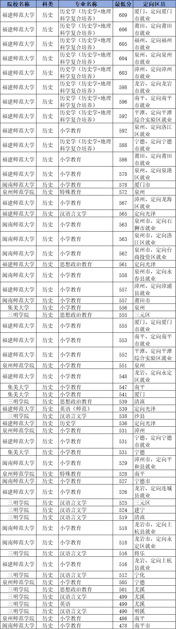 2024年在福建历史科目组招收考生的学校一共有5所院校,涉及到8个专业,其中收分最高的是福建师范大学历史学(历史学+地理科学复合培养),2024年的最低分数线为609分,定向厦门市就业;收分最低的是闽南师范大学小学教育,2024年的最低分数线为478分,定向南平市。
