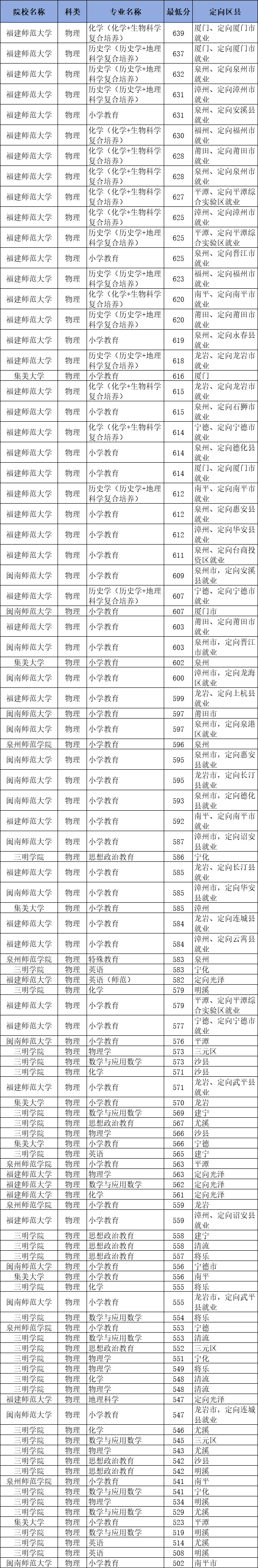 2024年在福建物理科目组招收考生的学校一共有5所院校,涉及到11个专业,其中收分最高的是福建师范大学化学(化学+生物科学复合培养),2024年的最低录取分数线为639分,定向厦门市就业;收分最低的是闽南师范大学小学教育,2024年的最低录取分数线为502分,定向南平市。