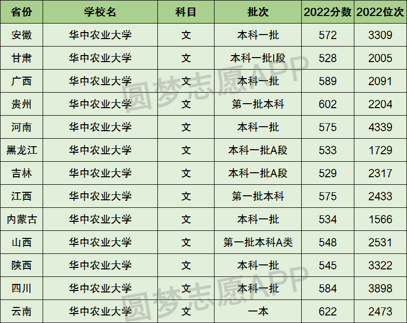 1、华中农业大学在全国普通高考省份的【文科】招录数据,包含招生批次等信息: