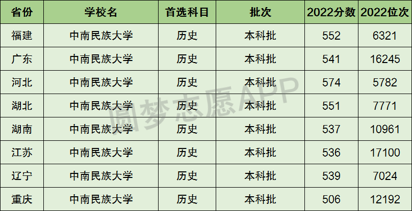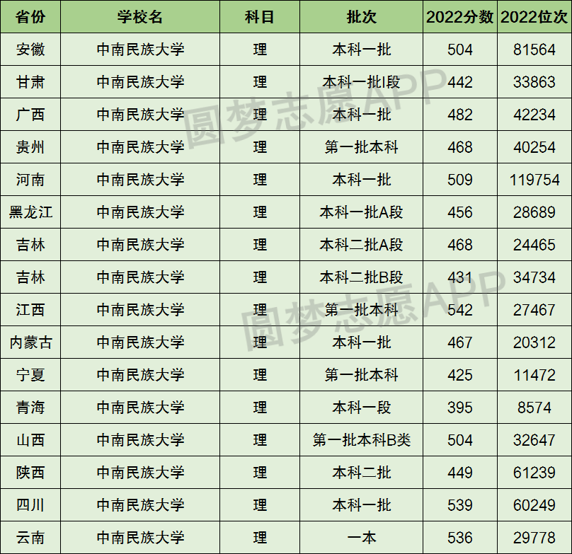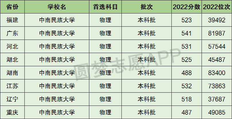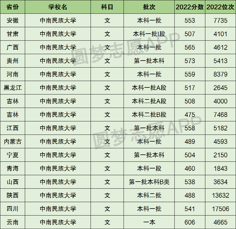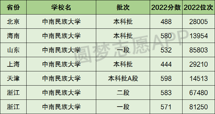 下面圆梦志愿将为大家展示中南民族大学2022年在全国各省市的最低分数线和位次,大家可以在了解中南民族大学在全国各省详细招生批次的同时,也顺便看看中南民族大学的招生录取分数线是多少!