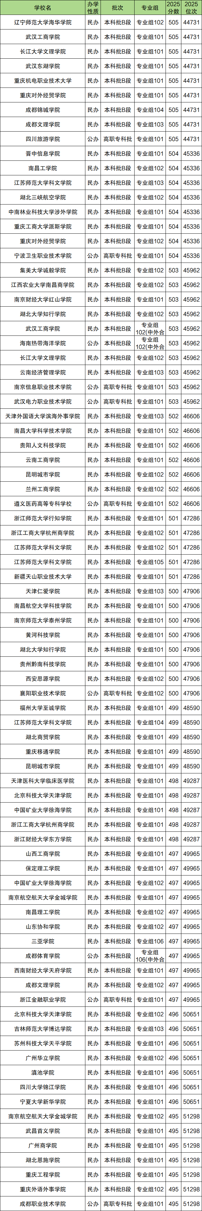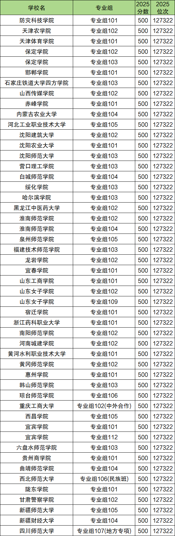 篇幅有限,下面展示录取分数线刚好为500分的大学名单: