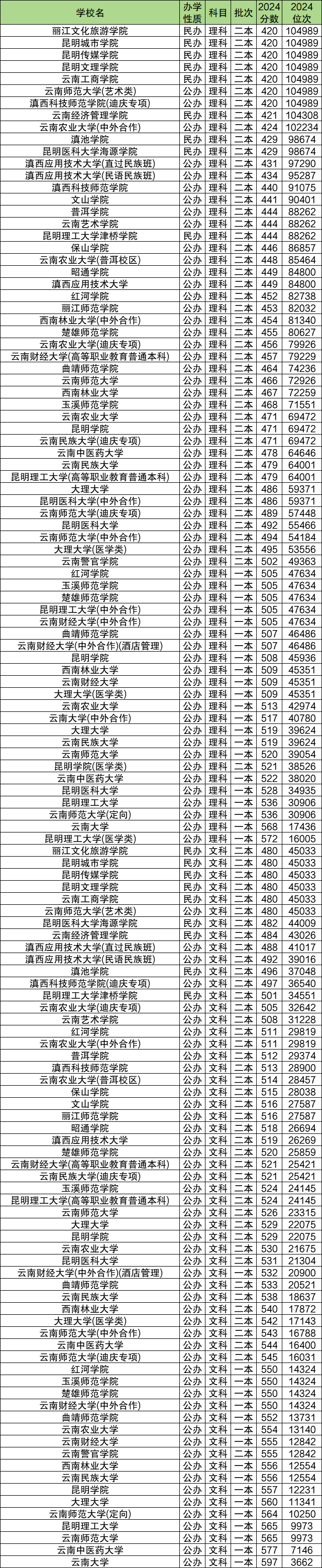 2025年云南各大学录取分数线一览表(需滑动查阅):