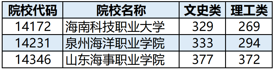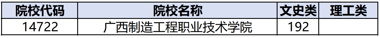 广西高职高专提前批征集志愿中参与学校有广西制造工程职业技术学院(文史类最低192分)、海南科技职业大学(文史类最低329分)、泉州海洋职业学院(文史类最低333分)、山东海事职业学院(文史类最低377分)。