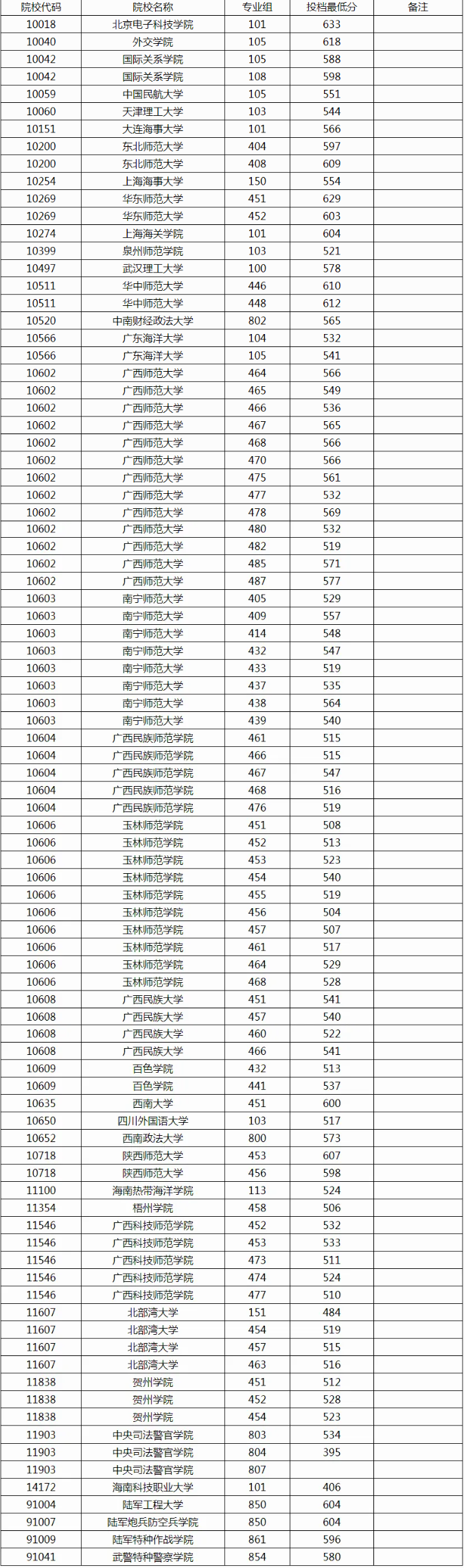 广西本科提前批征集志愿全国学校名单及分数线如下图