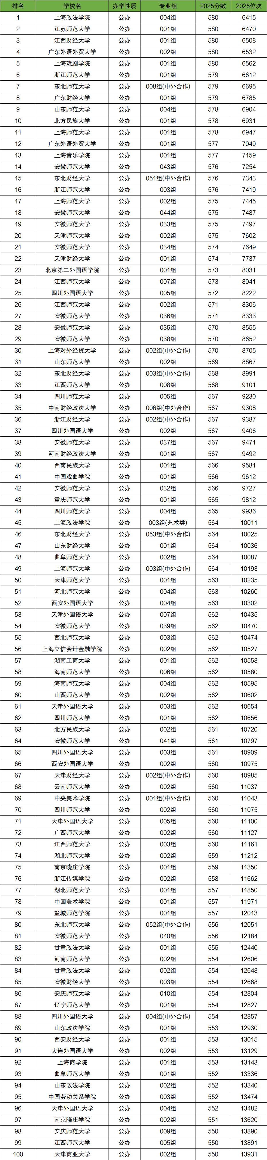 下方表格以安徽高考历史类2025年的招生情况为例,展示了全国550到580分的文科大学最低录取分数线排名,共计56所(100个院校专业组),供2026年高考生参考!