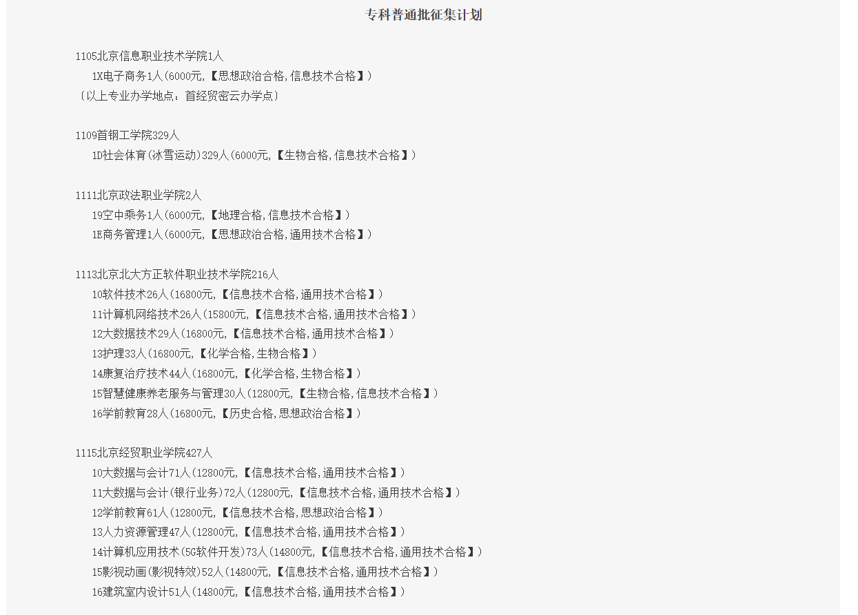 北京专科征集志愿包含的学校有:首钢工学院、北京科技经营管理学院、北京劳动保障职业学院、北京艺术传媒职业学院、唐山幼儿师范高等专科学校、德阳城市轨道交通职业学院等