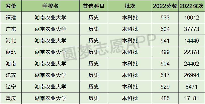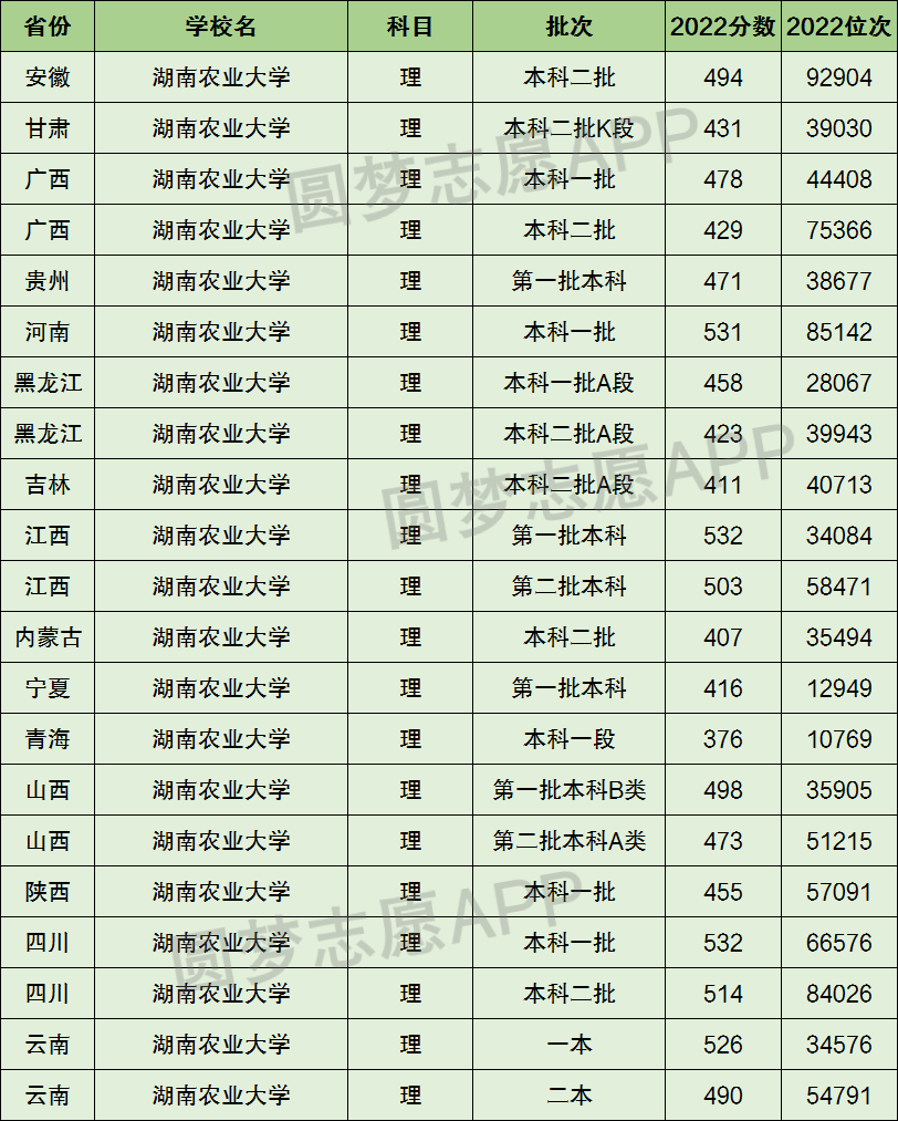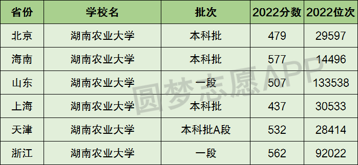 下面圆梦志愿将为大家展示湖南农业大学2022年在全国各省市的最低分数线和位次,大家可以在了解湖南农业大学在全国各省详细招生批次的同时,也顺便看看湖南农业大学的招生录取分数线是多少!