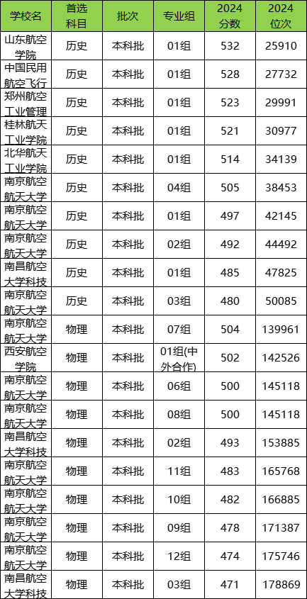 历史录取分数线最低,最好考的航天航空大学:南京航空航天大学金城学院(03组),2024年最低分为480分,最低位次在50085名;其次是南昌航空大学科技学院(01组),最低分都在485分,最低位次在47825名。