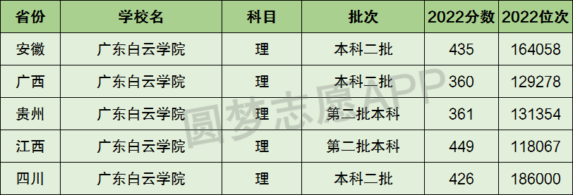 2、广东白云学院在全国普通高考省份的【理科】招录数据,包含招生批次等信息: