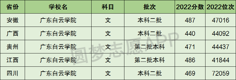 1、广东白云学院在全国普通高考省份的【文科】招录数据,包含招生批次等信息: