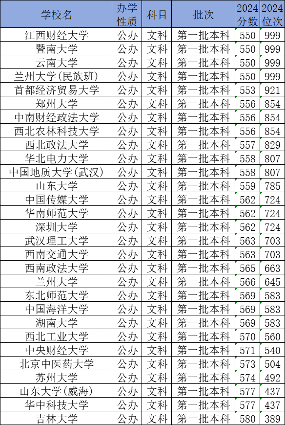 下面是文科生550-580分能上的大学名单一览表: