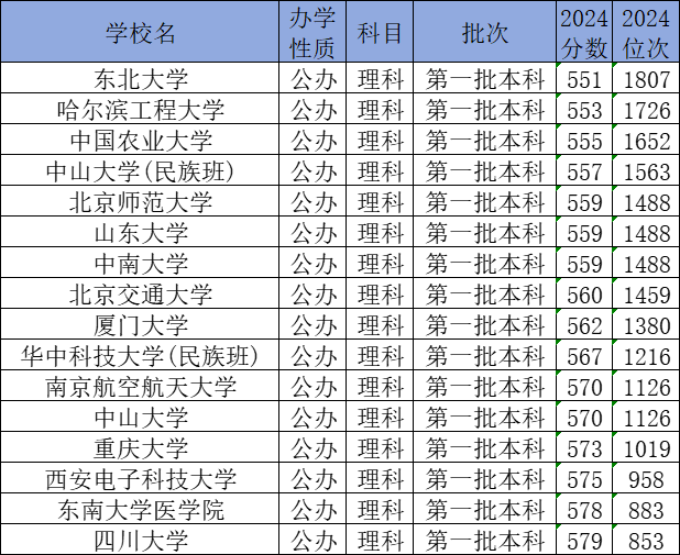 下面是理科生550-580分能上的大学名单一览表: