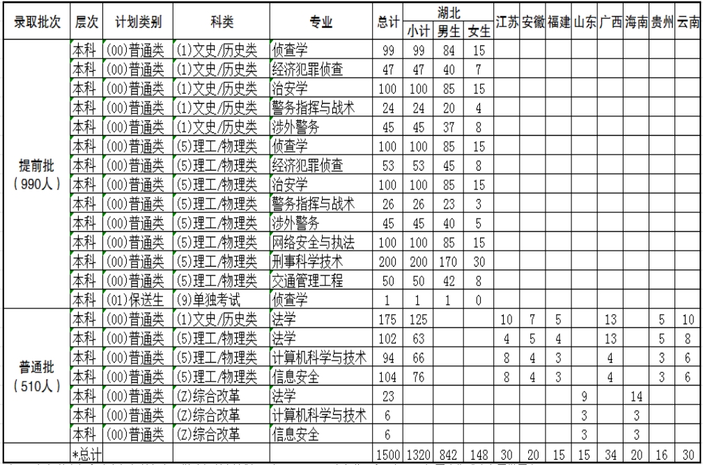 2024湖北警官学院面向本科计划招生人数为1500人,包含公安专业总数990人,非公安专业总数510人。