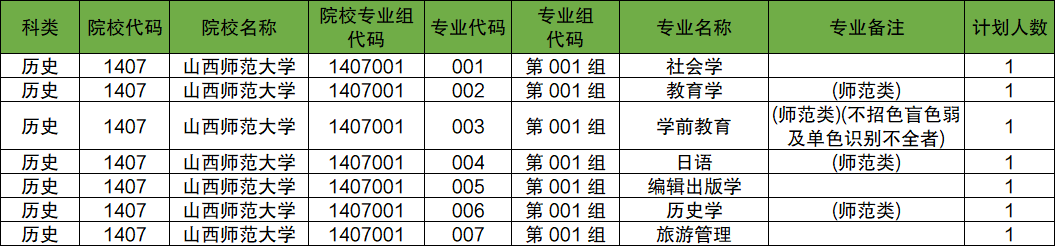 第001组:专业组代码为1407001,包含专业社会学、教育学、学前教育、日语、编辑出版学、历史学、旅游管理。