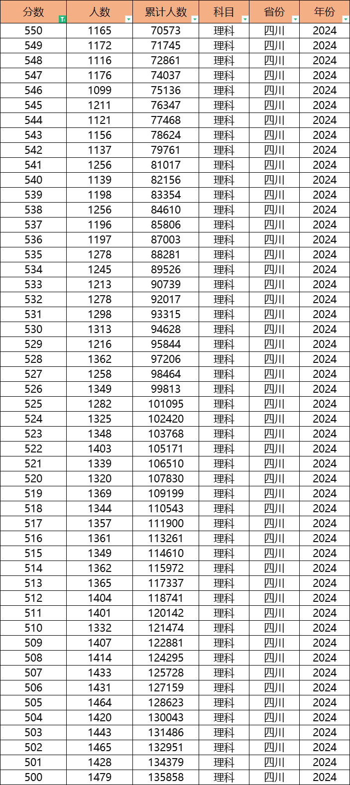 通常查询四川文科一分一段表可以得知,500分累计的人数是39618、550分累计的人数是10804、551分累计的人数是10488。