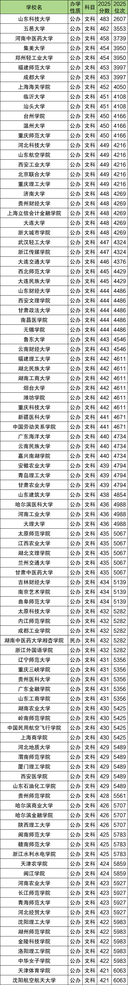 上文整理的均是各地二本最低录取分数线,但二本大学根据招生院校层次、报考热度的不同,最低录取线是存在较大差异的。比如在新疆文科,2025年全国二本大学最低录取分数线位于330分到483分之间,压线录取的有天津天狮学院、青岛滨海学院、萍乡学院(公办)、吉林外国语大学、湖南城市学院(公办)、汉口学院、西安欧亚学院、上海建桥学院、武汉晴川学院等,分数线最高的是山东科技大学,高于二本线153分录取。