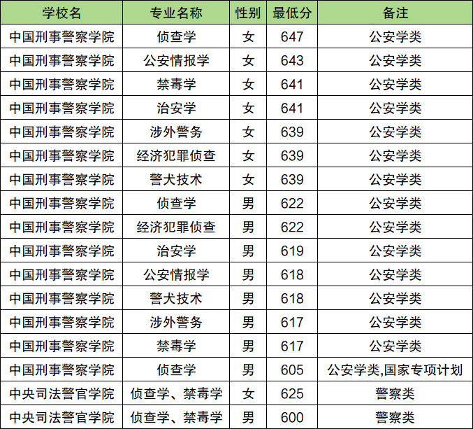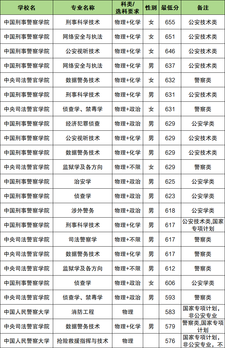 要求物理+化学的是中国刑事警察学院和中央司法警官学院,如网络安全与执法(女生)前者最低651分、数据警务技术(男)后者最低579分。具体专业名单及分数线如下表所示: