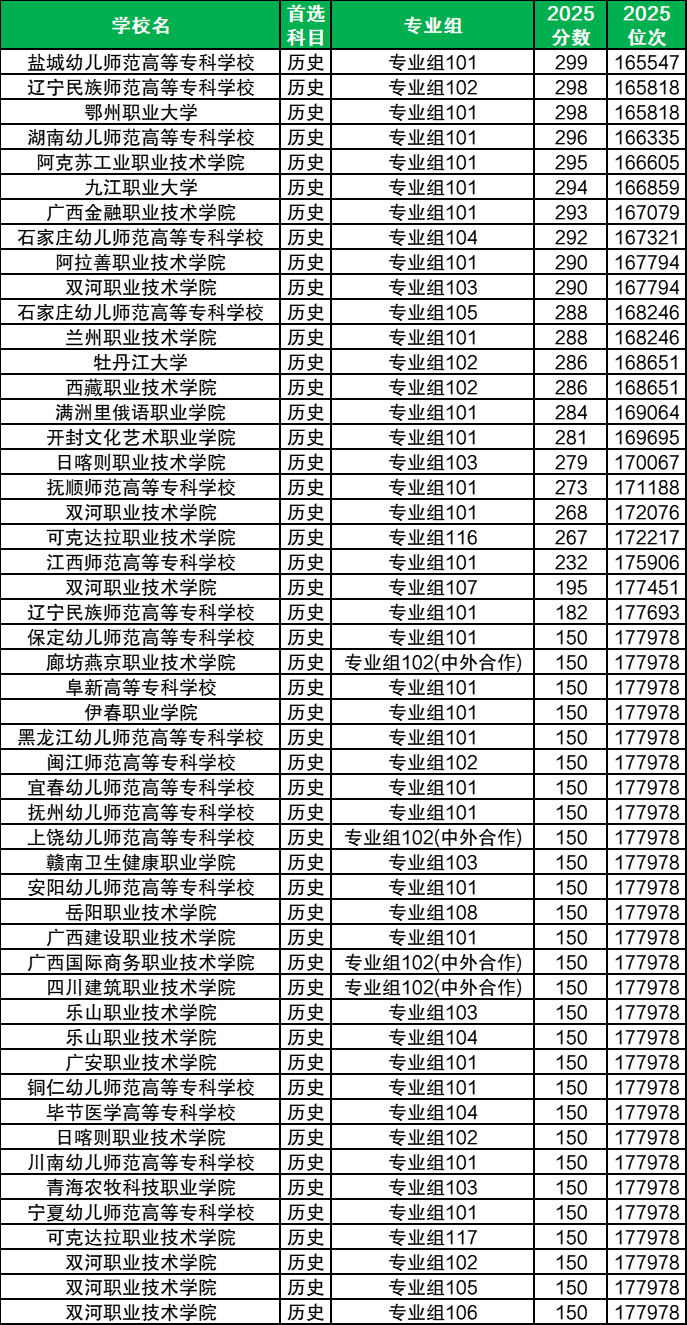 2025年历史类300分稳上的公办大专院校有41所,其中录取分数线最低为150分,最低分对应的院校专业组有双河职业技术学院(106组)、可克达拉职业技术学院(117组)、青海农牧科技职业学院(103组)、广安职业技术学院(101组),它们的最低位次排名为177978名。