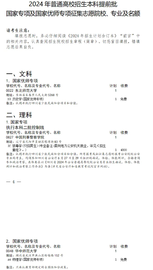 以下为2024年本科提前批国家专项、国家优师计划、农村订单定向医学生征集志愿计划院校名单及招生计划和要求:
