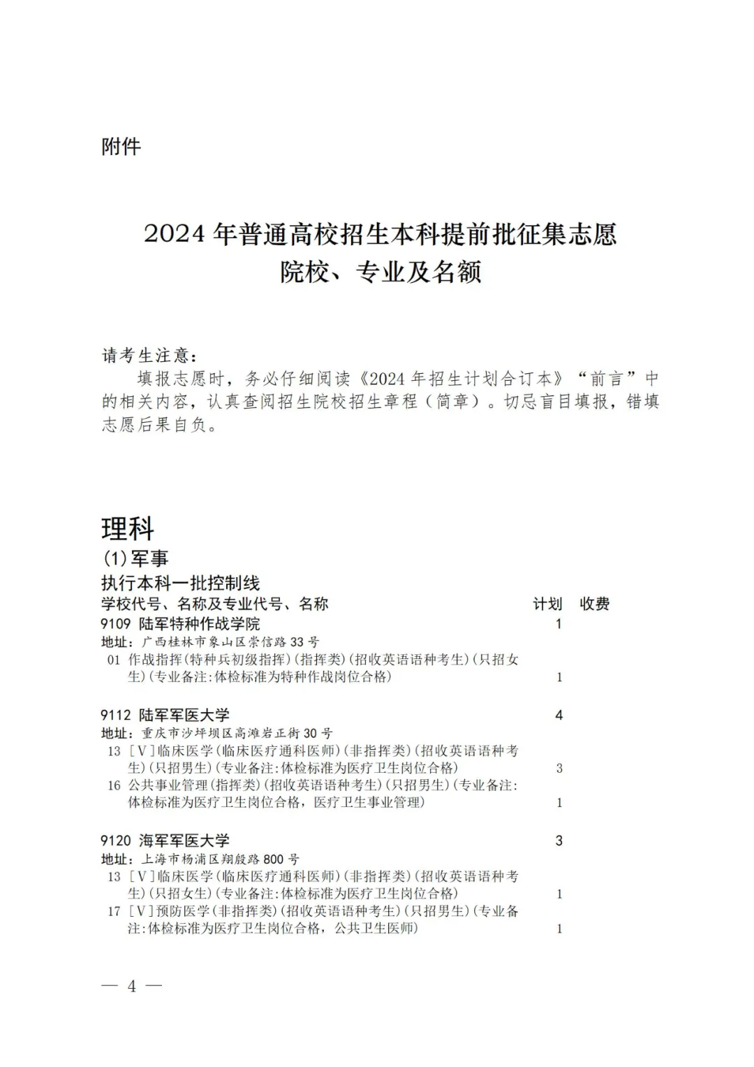 以下为2024年本科提前批征集志愿计划院校名单及招生计划和要求: