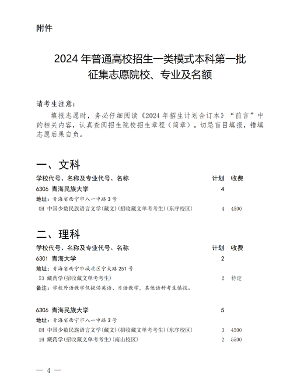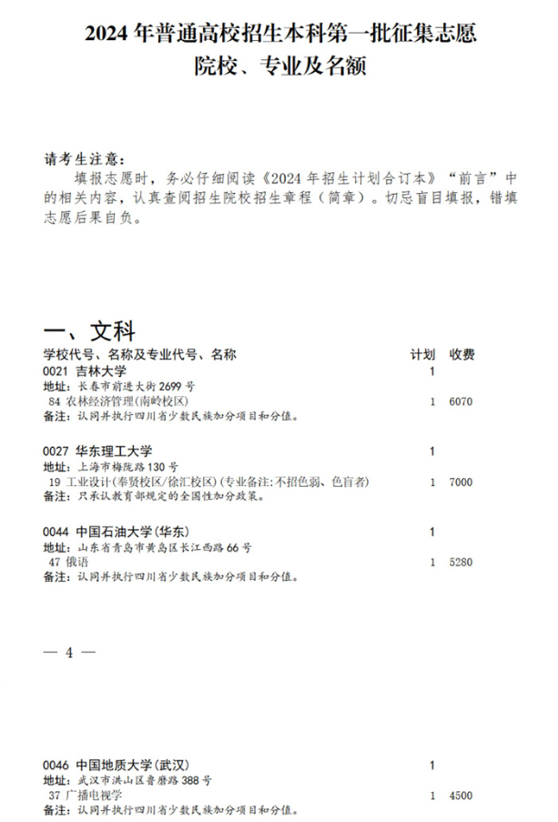 以下为2024年本科第一批征集志愿计划院校名单及招生计划和要求: