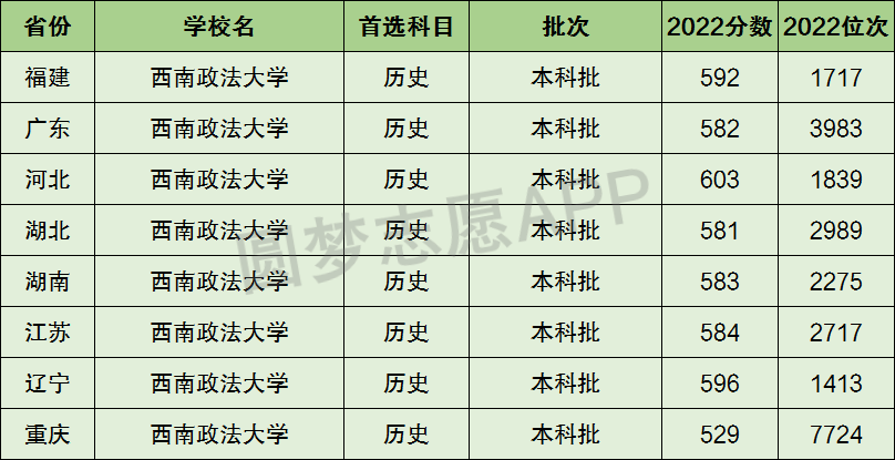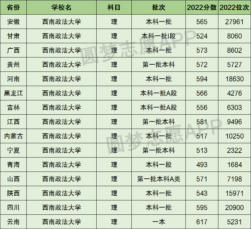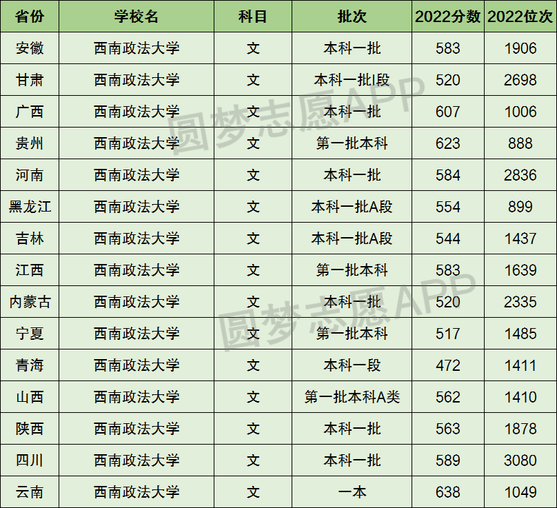 1、西南政法大学在全国普通高考省份的【文科】招录数据,包含招生批次等信息: