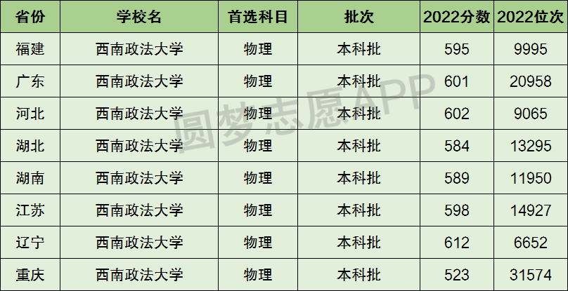 5、西南政法大学在3+1+2新高考省份【首选物理】的招录数据,招生批次为本科批: