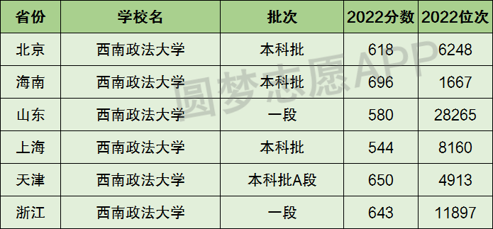 下面圆梦志愿将为大家展示西南政法大学2022年在全国各省市的最低分数线和位次,大家可以在了解西南政法大学在全国各省详细招生批次的同时,也顺便看看西南政法大学的招生录取分数线是多少!