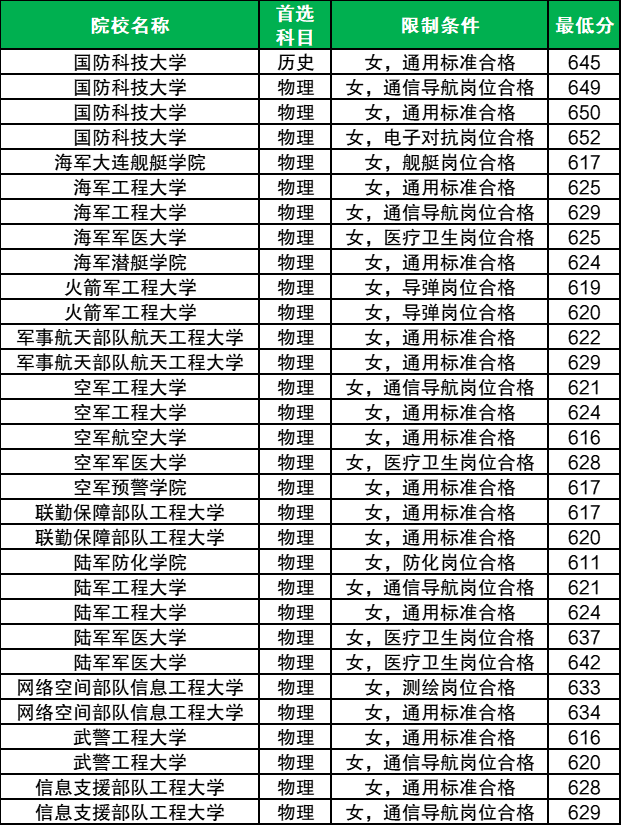 下面根据2025年全国各省军校招录数据,整理出了各省女生考军校最低分数线,可供参考: