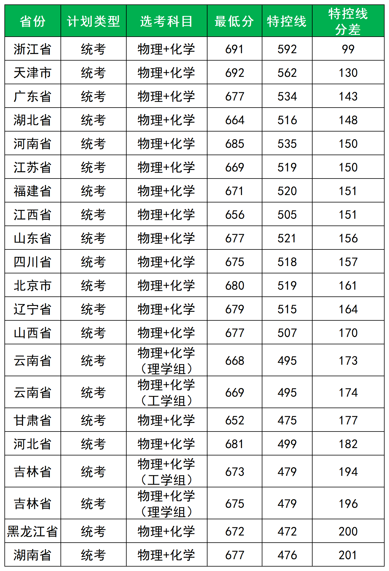 2025年国科大在高考统招中,最低录取分范围为654-692分,与特控线的分差在99-201分。最低录取分与特控线差值最小的省份为浙江省(99分),差值最高的是湖南省(201分),平均需超特控线163分。