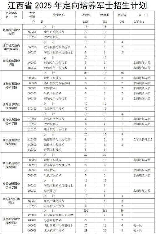 2025年江西省共为解放军和武警部队招收定向培养军士1225人,其中女军士4人。