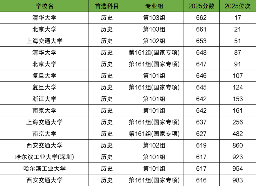 历史类高分段的C9大学专业组有:清华大学第103组、北京大学第103组、上海交通大学第102组等,这些大学专业组2025年高考最低录取分数线均在650分及以上。