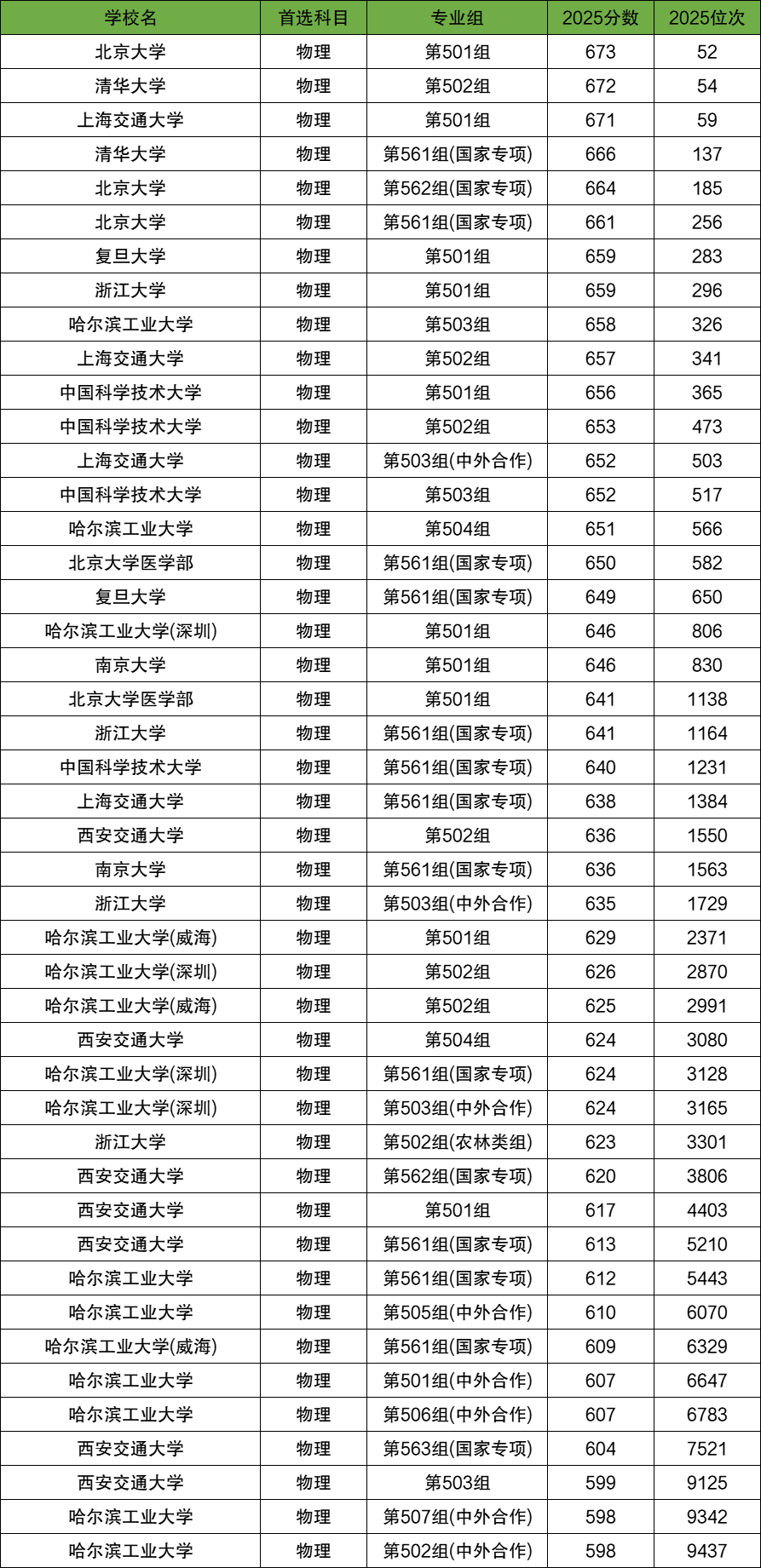 物理类高分段的C9大学专业组有:北京大学第501组、清华大学第502组、上海交通大学第501组、清华大学第561组(国家专项)、北京大学第562组(国家专项)等,这些大学专业组2025年高考最低录取分数线均在660分及以上。