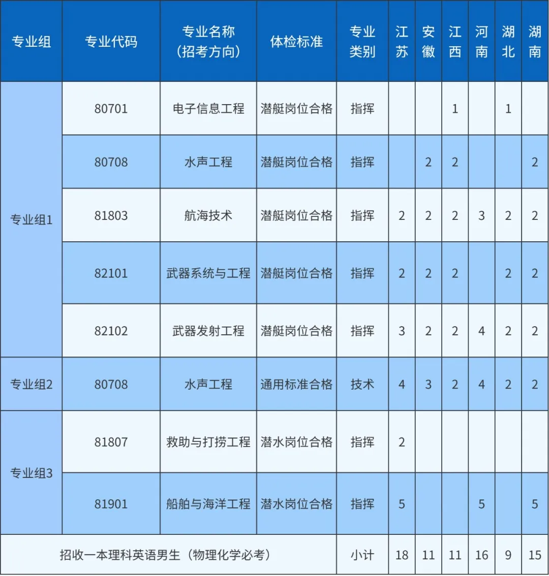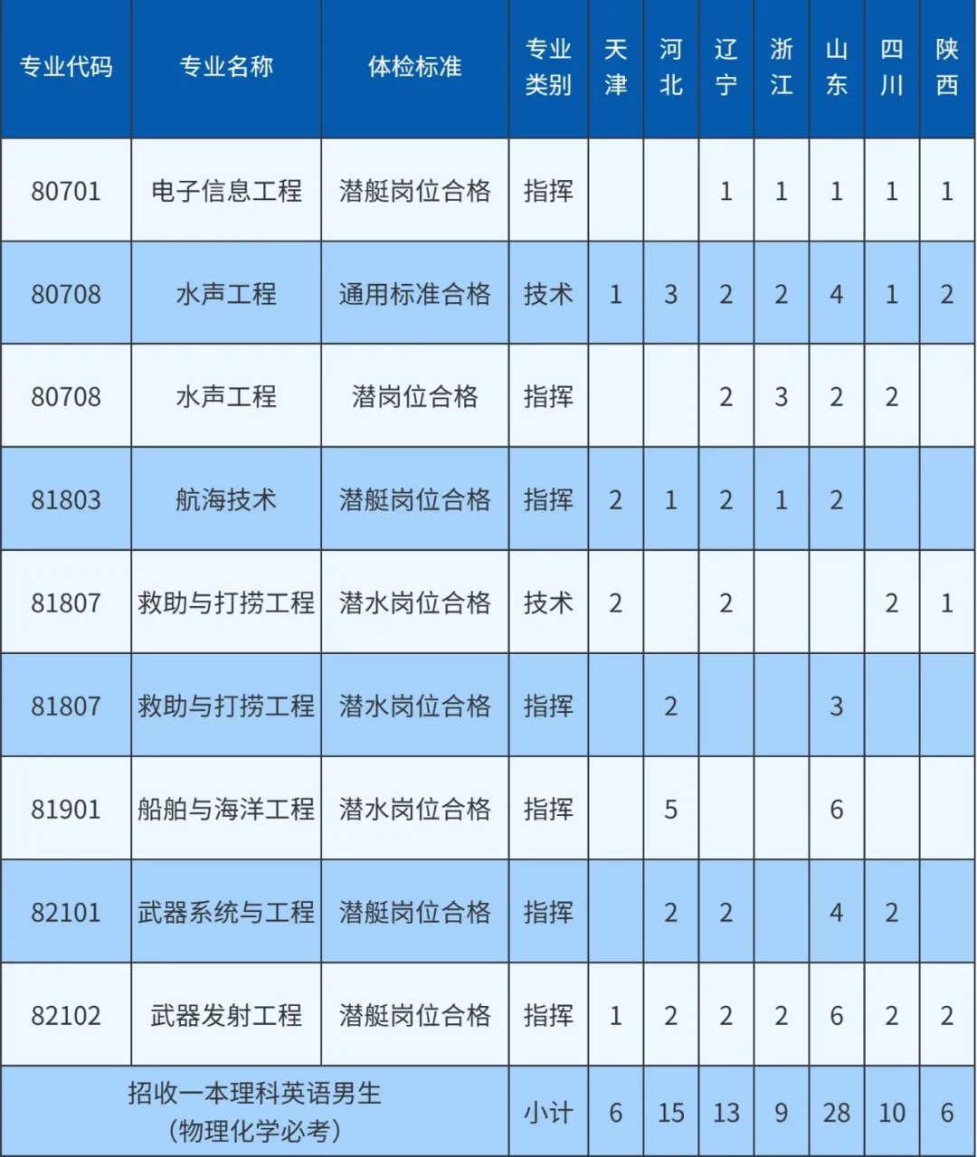 招生专业:包括电子信息工程、水声工程、航海技术、救助与打捞工程、船舶与海洋工程、武器系统与工程、武器发射工程等7个本科专业。