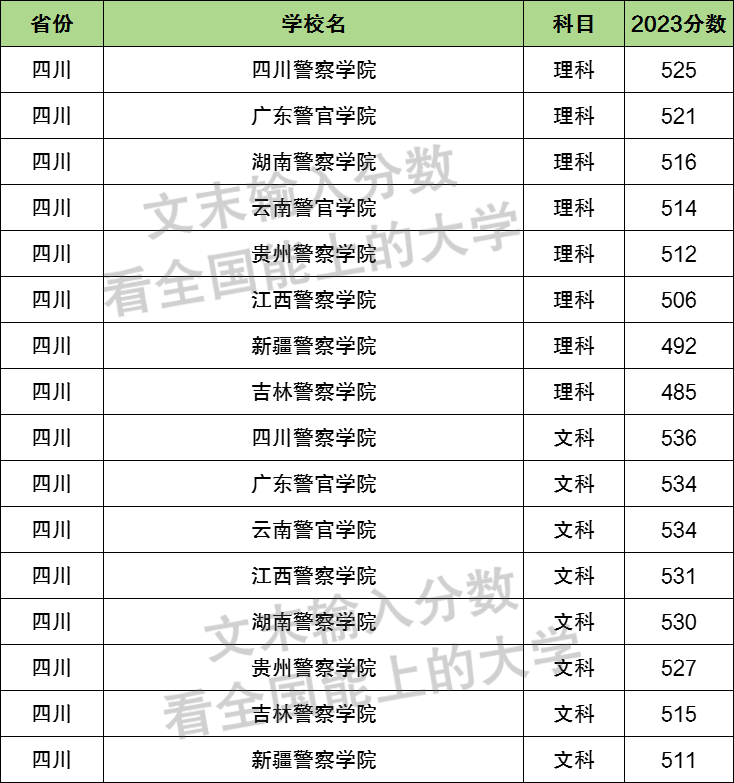 下表为全国二本大学在四川省文科、理科分数的警察学院。