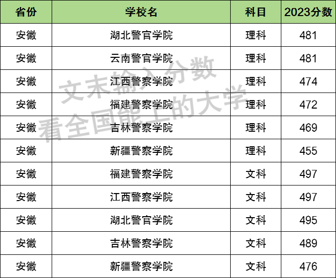 下表为全国二本大学在安徽省文科、理科分数的警察学院。