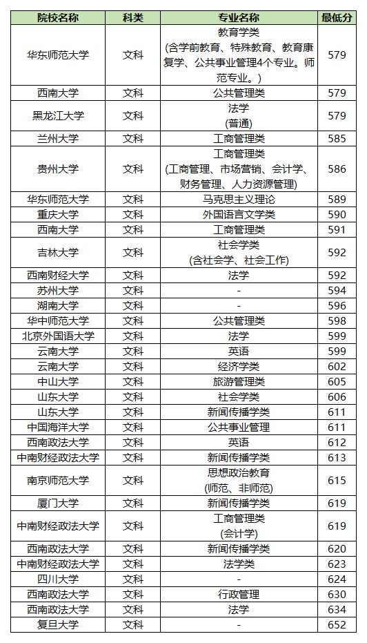 云南高校专项计划文科录取分数线范围在579分~652分不等,分数要求最低、最容易报考的高校专项计划大学是华东师范大学(教育学类)、西南大学(公共管理类)和黑龙江大学(法学)。其次是(外国语言文学类(工商管理类585分)。而分数要求最高、最难报考的高校专项计划大学是复旦大学,分数为652分。