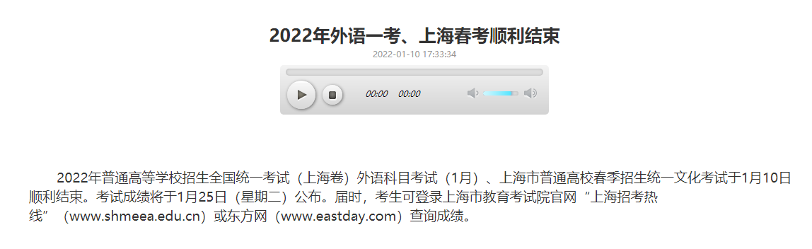 考试成绩将于1月25日(星期二)公布。届时,考生可登录上海市教育考试院官网“上海招考线”(www.shmeea.edu.cn)或东方网(www.eastday.com)查询成绩。