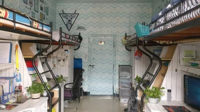 (1)分有四人间宿舍、八人间宿舍。四人间宿舍为上床下桌,八人间宿舍另附有一公共学习空间。床大小均为2x0.9m(长x宽);