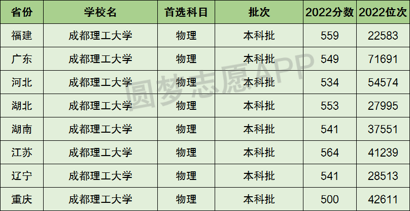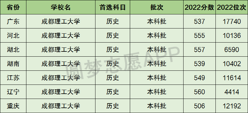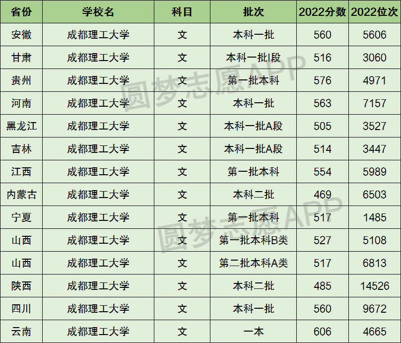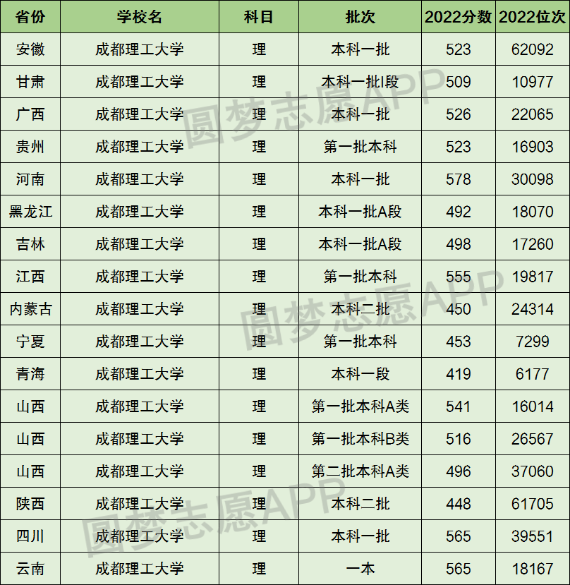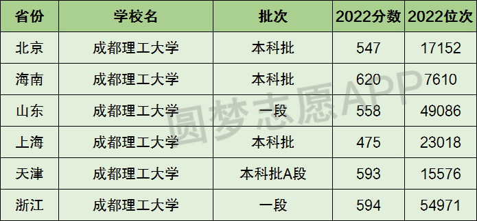 下面圆梦志愿将为大家展示成都理工大学2022年在全国各省市的最低分数线和位次,大家可以在了解成都理工大学在全国各省详细招生批次的同时,也顺便看看成都理工大学的招生录取分数线是多少!
