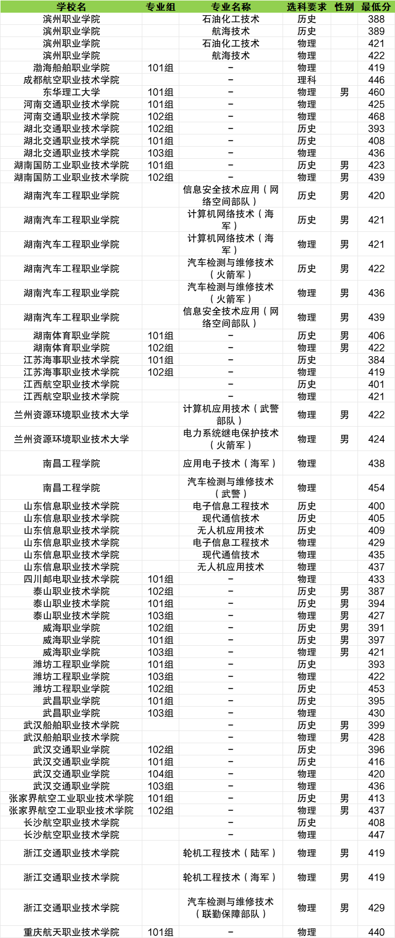 2024年广东定向士官录取分数线最低是:历史类384分、物理类419分,收分最低的学校历史类为江苏海事职业技术学院、物理类为浙江交通职业技术学院。此外物理类分数线最高的士官学校是河南交通职业技术学院,2024年最低分468分;历史类分数线最高的学校为潍坊工程职业学院,2024年最低分453分。