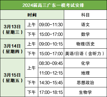 2024广东一模安排在3月13-15日开考,关于本次十门考试科目的具体时间安排,详情如下: