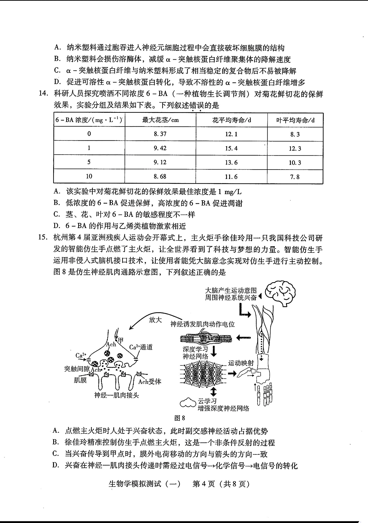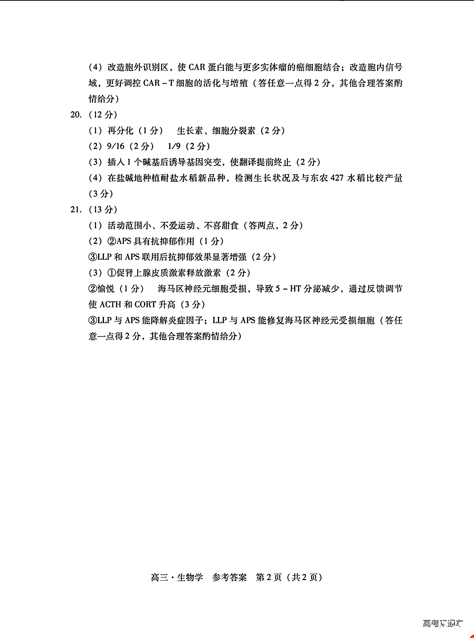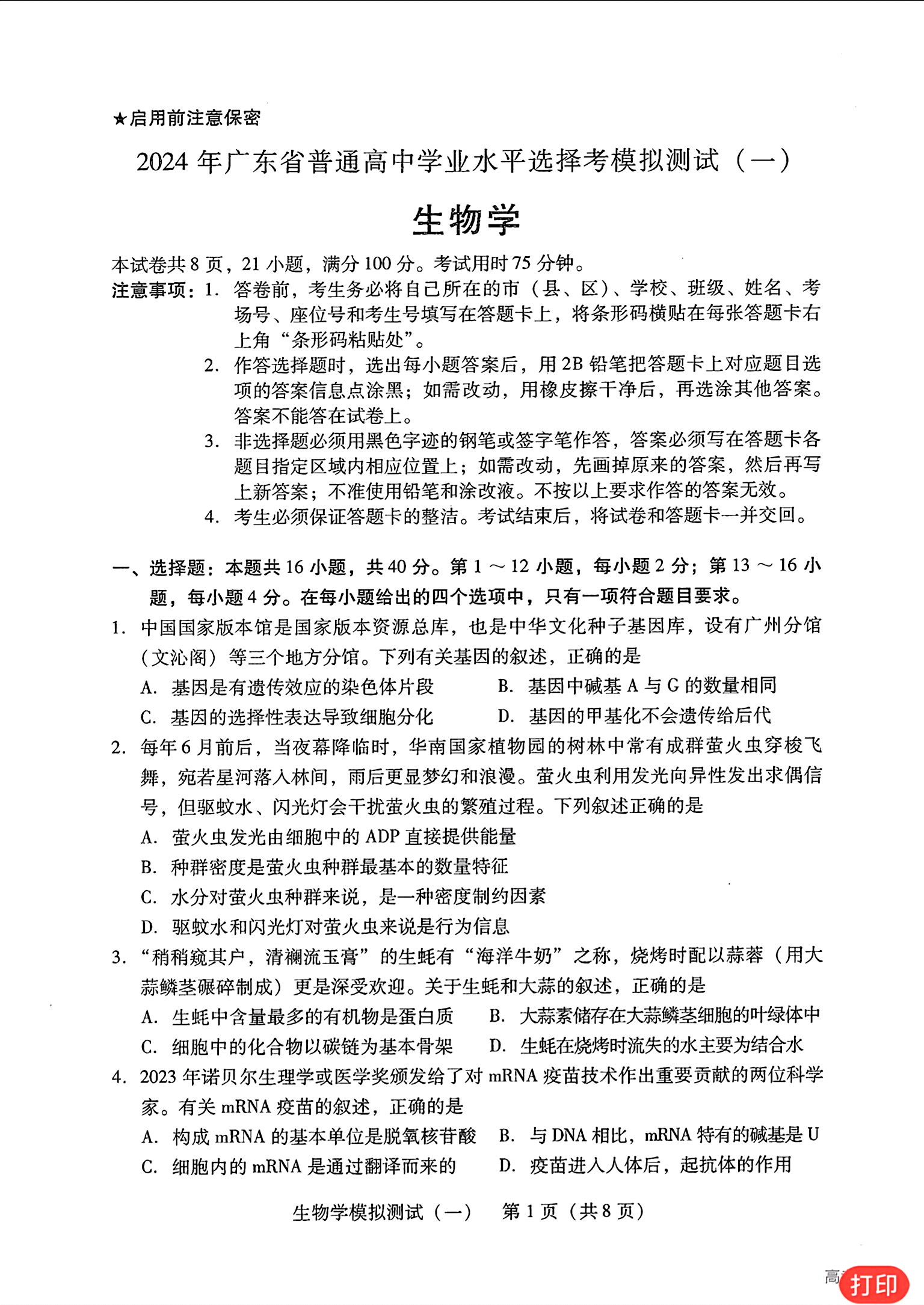 8.2024广东一模生物答案及试卷解析