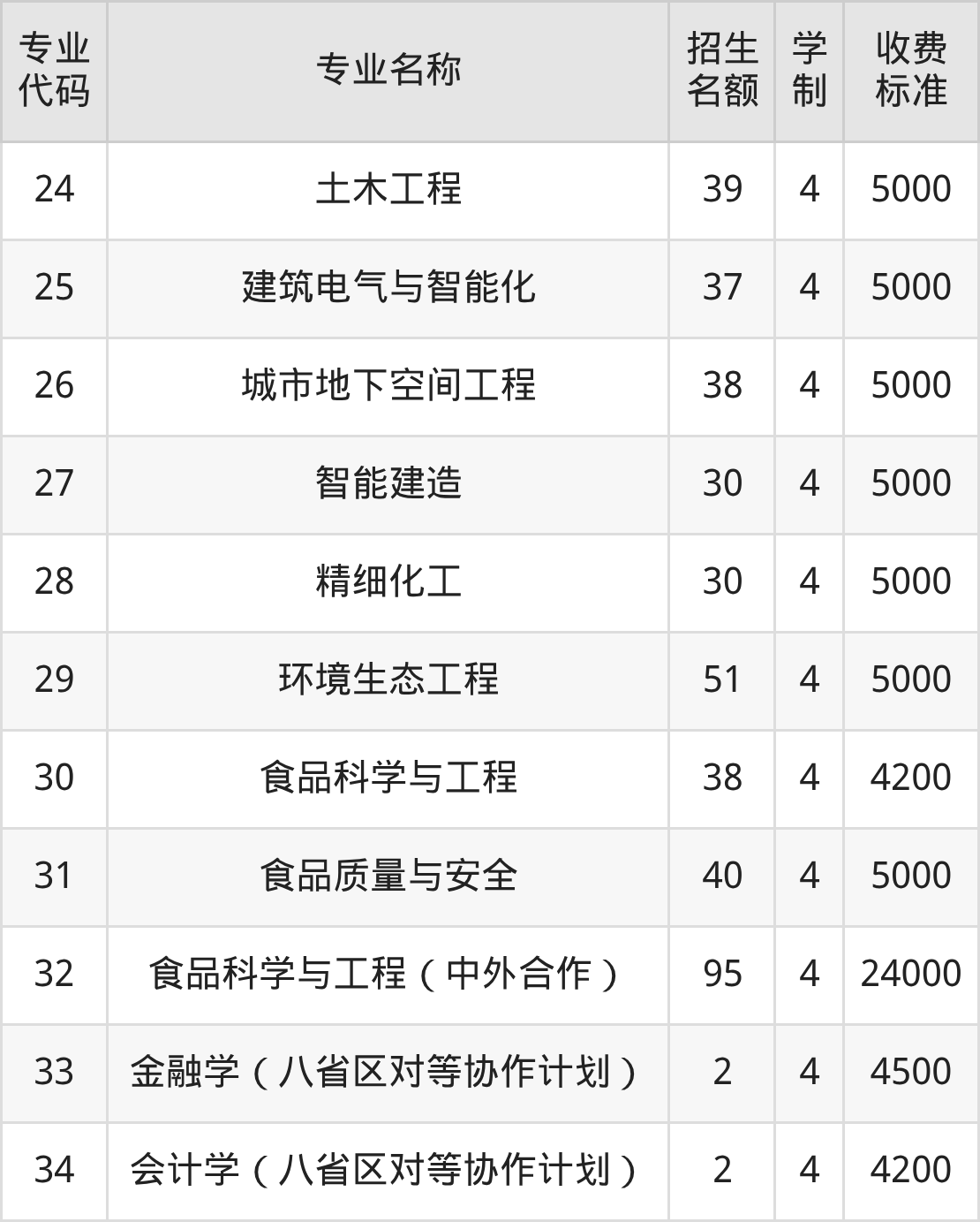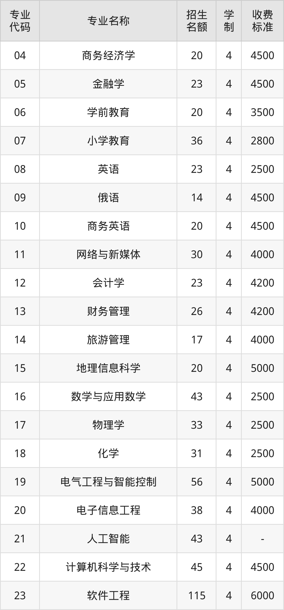 | 专业 代码 | 专业名称 | 招生 名额 | 学 制 | 收费 标准 |