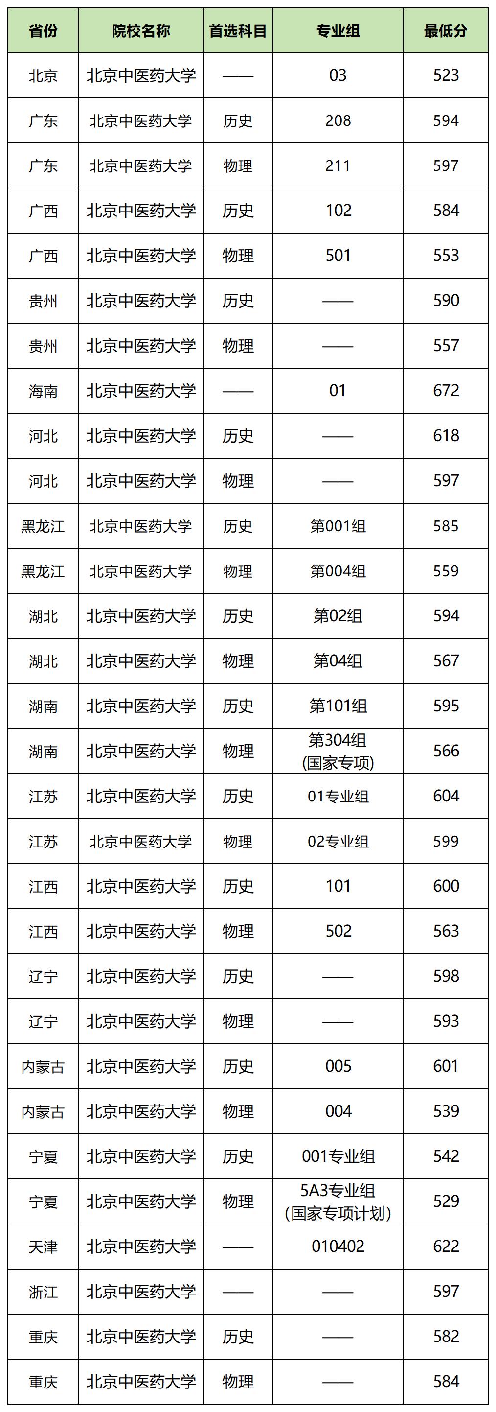 2025年北京中医药大学在广东招生最低分为594分(历史类);